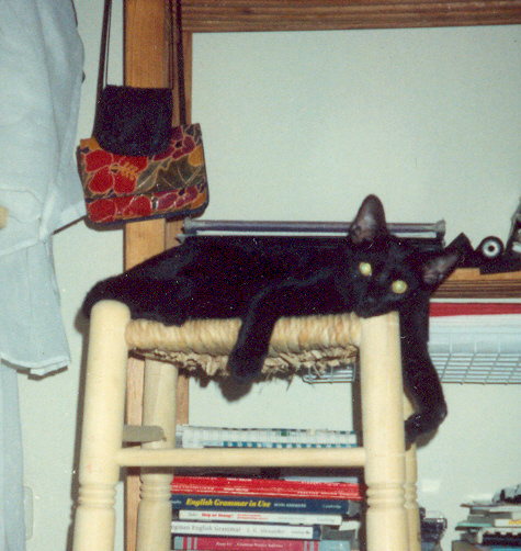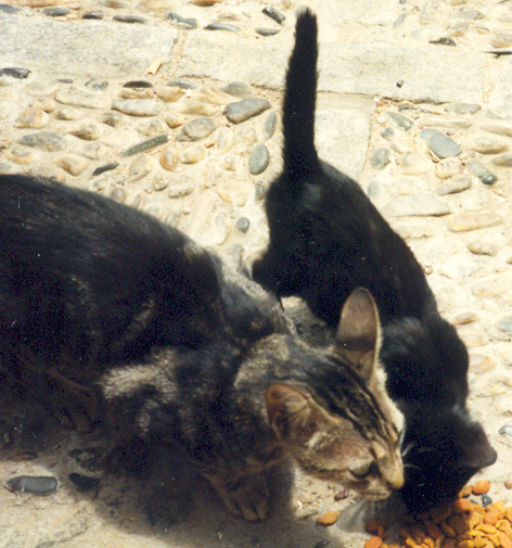 Meanwhile, I kept going to feed Holly and a few weeks later (on April 7th) she gave birth to six kittens – two tabbys like her, two black ones like Cat and two black ‘n white ones (obviously some other dude’s). I kept on feeding her every day, but after awhile I noticed that one by one the kittens were disappearing – it turned out that someone was killing them off! I remember one day finding a little tabby kitten head in the gutter. And so finally there was just one kitten left – a little black one.