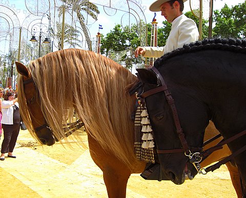 The reasons I prefer the Feria de Jerez are because, unlike the massive and very cliquey one in Sevilla, this one really feels like a fair should. Most of the casetas are public and very charming, it’s located in a lovely park with palm trees and flowers … and then there are the horses. Jerez is famous for its horses and is the horse capital of Andalucía.