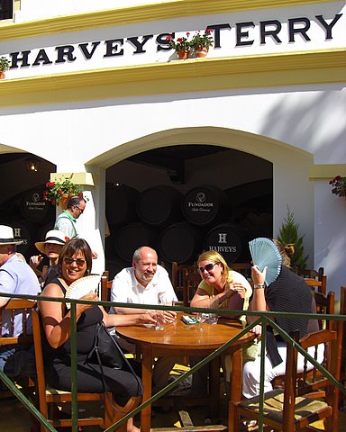 After a stroll around the fairground Pipocas & family had to get going, so the rest of us carried on seriously drinking being festive and stumbled into this caseta owned by the famous Domecq family. That’s “J”, Nog, “R” and R’s camera-shy friend enjoying getting fried in the very hot sun.