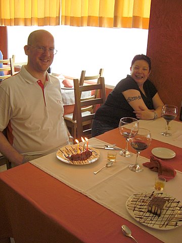 After having some mid-day birthday cava at Bar Campanario Sara invited us all out for lunch, which was an excellent opportunity to try out an Argentinian restaurant I came across when Nog and I were out cycling the other day. And it was fabulous! We ate so much food that I thought I was going to have to lie down for awhile about half-way through. And the Argentinian cabernet was also delicious. After our meal we were brought some orangy-tasting Argentinian liqueur (on the house) that was very nice. Then the boys ordered dessert. Steve’s came with candles because I’d mentioned to our excellent waiters that it was his birthday. And then Rafael brought over a bottle of cava for us (also on the house) … at which point I had to give up because I couldn’t drink any more.