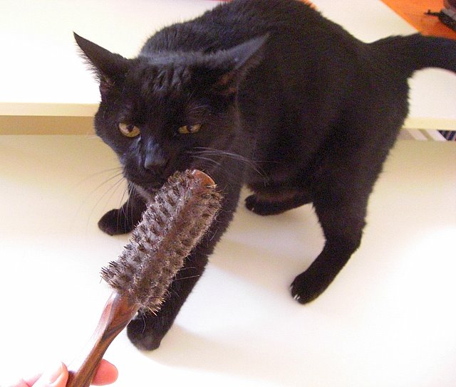 Not an especially furry brush in January – in summer I could knit a whole other cat from the fur that collects on the brush.