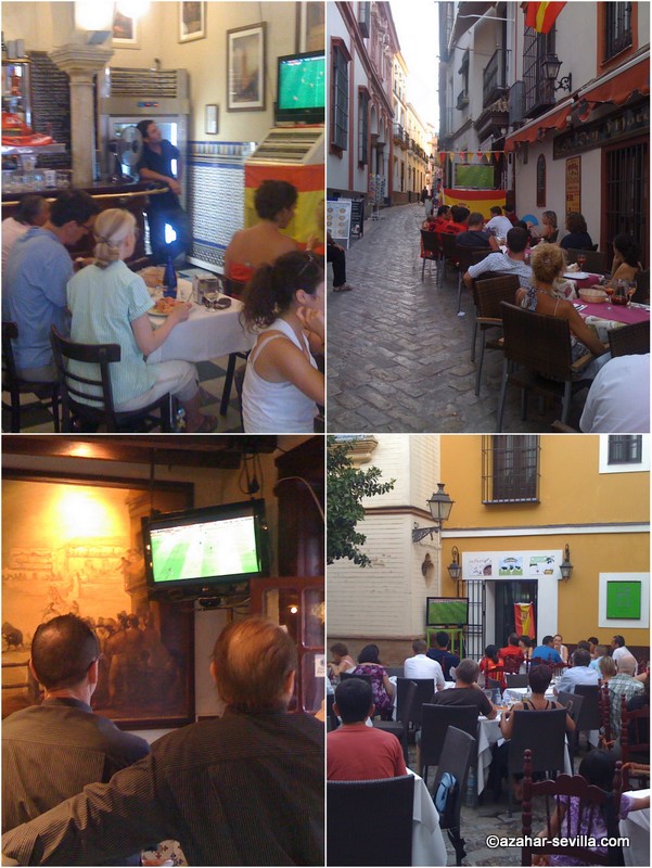 First off I should say that I’m not actually interested in football, though I’ve occasionally watched important matches. The UEFA Cup final in 2003 comes to mind. And so last night, just before the Spain/Netherlands World Cup final began I suggested to Nog that we go out and find a bar showing the game on television. We first tried Cervecería Giralda across the street but it was packed out. Then I remembered that when I was giving a mini tapas tour the previous week I took my client to Casa Roman – there was a match that night too and all the staff were standing around like meerkats, eyes glued to the telly. So we went over there and, sure enough, same scene but not overly-crowded. In fact, we even managed to pull up a couple of chairs quite close to the “action” and grab a couple of beers. The match had begun.