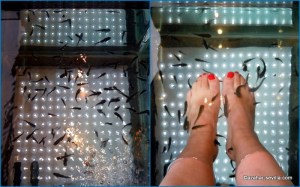 Look! More gifts from abroad! This time from the marvelous Madam Teuchter, who met up with me when I was in London and we spent a lovely afternoon going for lunch, then walking around Covent Garden and Neal’s Yard before heading out to Kensington for a fabulous treat she had in store for us… getting our feet nibbled on by tiny fish! Well, I’m afraid that in my case those fish had their work cut out for them, and it didn’t help when I broke a glass shelf