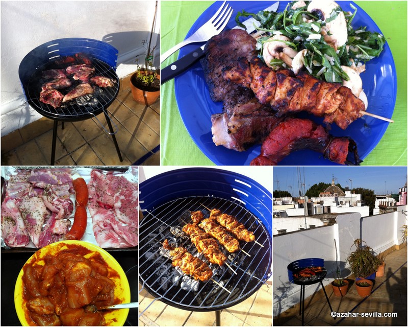 The first thing we actually did was head over to the Encarnación Market in the morning to get some MEAT and ended up with enough for a family of four: lamb ribs, chorizo, secreto (a streaky cut of pork) and chicken breasts. We figured it made sense to cook enough to have lots of leftovers instead of letting the coals go to waste. I marinated the chicken in harissa sauce to put on skewers, but the rest just went on the grill with a little salt & pepper.