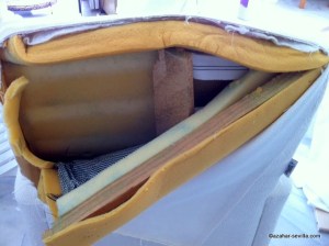 A couple of weeks ago I noticed that the back of my comfy chair (inherited from Agustín a few years ago) had gone a bit wobbly. Then it started sinking on one side, getting worse and more wobbly by the day. And so I thought the best thing to do would be to cut it open and see what the problem was. This is what I saw.