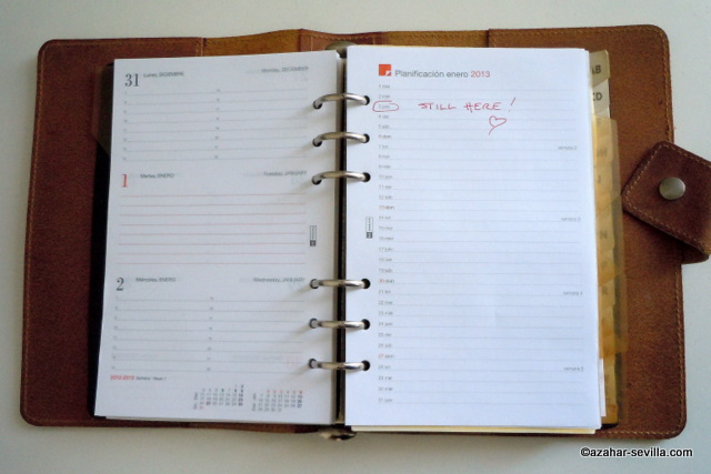 Back on January 3rd 2009 I posted my first Photohunt entry. The theme that week was “hope” and I put up a photo of my daybook turned to January 3rd 2010 with the words “STILL HERE!” written on it. Since then I have posted a new version of this hopeful photo every year on this date, but this year when I turned the pages to find January 3rd 2013 I saw that it stopped on January 2nd (!!!), which seemed a bit ominous…