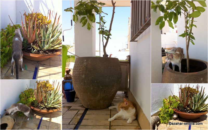 It wasn’t quite so blazing hot this past weekend so I took the opportunity to break out the BBQ for the first time this summer. Really I should BBQ all year round EXCEPT for summer since usually the only times it’s bearable to do so is either 9 am or midnight… a sunny January afternoon would be much more comfortable. Anyhow, everyone had a great time including little Luna, who took to inspecting all the plants and finding hiding places (as you can see, Loki is content to find a nice shady spot and stay put). I still wouldn’t feel comfortable letting the cats out on the terraza on their own, but they love coming out when I’m hanging up laundry, watering plants, etc.