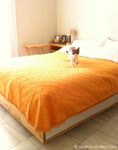 Meanwhile… I LOVE my new bed. The mattress is a combination of coils with a thick layer of latex on top. At first I thought it was too soft, but that is only when I sit on the edge of it. Actually lying down and sleeping on it is a dream. I also like that it’s smaller than the old king-size one and doesn’t take up the whole room, though it’s still roomy at 150 x 190 cms. And now that it’s cool enough for the duvet it’s a lovely cosy & comfy experience going to bed. Especially as the two young’uns have started joining me.