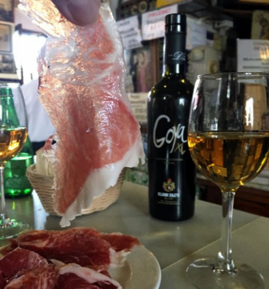 After a plate of perfectly sliced jamón Ibérico and some fabulous Goya manzanilla pasada at Las Teresas we headed over to La Azotea Santa Cruz for our “main course”. One of our favourite dishes was the courgette and anchovy salad with frozen grated goat cheese. Sue loved it so much she was inspired to create her own version of it when she got home to Alsace.