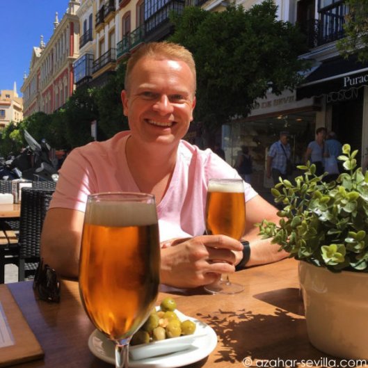 I met Tim @Biltawulf last year when he and his friend Ed came on a tapas tour with me. Then earlier this year Tim got in touch again – he was planning another trip to Sevilla, this time to celebrate his 40th birthday with four friends from London. I was looking for something different for him, and in the end took them out on Saturday afternoon for a Tasting Triana Tour. But as Tim arrived a day earlier than his friends, we met up on Friday afternoon too and he helped me with some Tapas Research. This turned into an impromptu tapeo, starting with cold beers in the sun before heading to Sahumo (which had a new tapas menu I was keen to try out), with a short detour to La Cata Ciega across the street, as we got there before Sahumo was open.