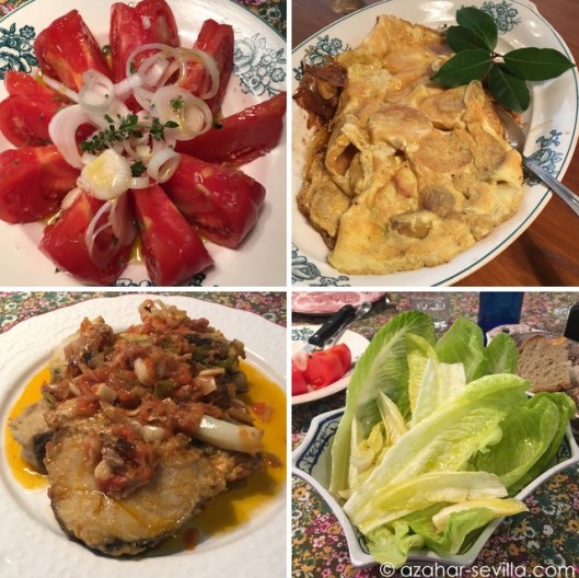 And so to our meal, taken at a leisurely pace through the course of the afternoon as Miguel prepared and cooked our food in the small open kitchen area next to us. First up was a simple salad of tomate rosa wedges garnished with sweet onion, marinated in olive oil and herbs that was a perfect start and exemplar of the importance of quality products. It was followed by a tortilla in the Galician style – softer and less dense than the traditional Andalucian version. Next a fish dish – fresh grilled hake with spring onions and a pimentón sauce, which was as good as any I’ve ever had. Finale was a pan-roasted 45-day aged beef that was succulent and full of flavour.