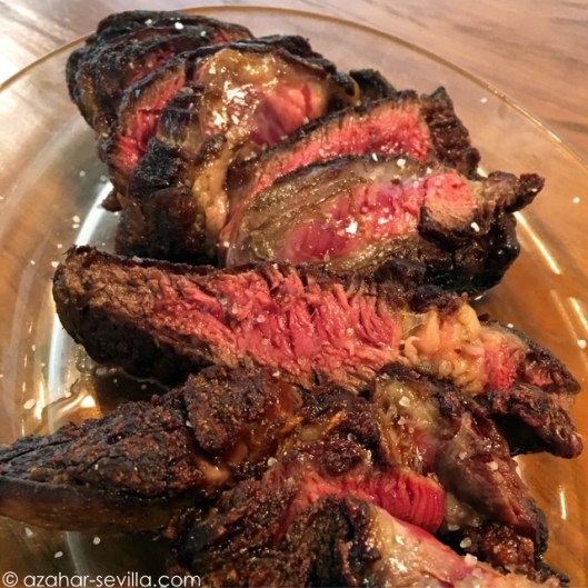And so to our meal, taken at a leisurely pace through the course of the afternoon as Miguel prepared and cooked our food in the small open kitchen area next to us. First up was a simple salad of tomate rosa wedges garnished with sweet onion, marinated in olive oil and herbs that was a perfect start and exemplar of the importance of quality products. It was followed by a tortilla in the Galician style – softer and less dense than the traditional Andalucian version. Next a fish dish – fresh grilled hake with spring onions and a pimentón sauce, which was as good as any I’ve ever had. Finale was a pan-roasted 45-day aged beef that was succulent and full of flavour.