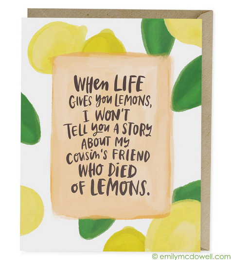 Thanks to Kate @sledpress for sending this my way. What an excellent idea. Empathy cards for serious illnesses – or what to say when you don’t know what to say – by Emily McDowell. Though of course I hope none of you will ever have to send me one, they are quite clever and right on the money. Reminded me of that list I posted here a few years ago… stupid things people say.