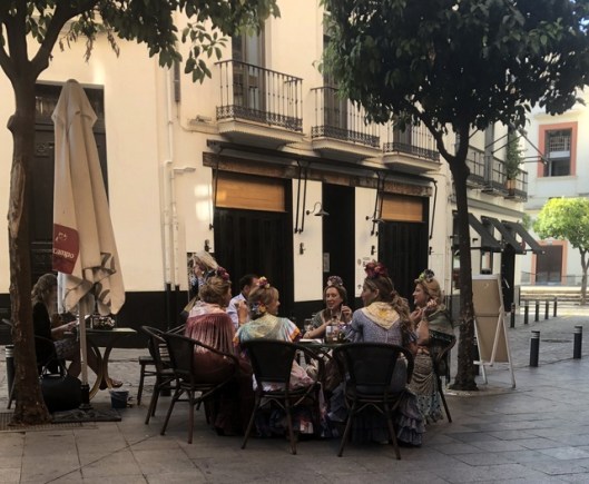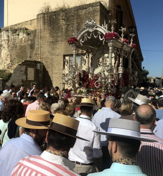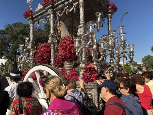 Years ago when I lived in Mateos Gago I seem to recall that when Sevilla left for El Rocío they started out later and the colourful oxen-pulled carts hung around outside the Cathedral for at least half an hour or so. But either things have changed or my memory is faulty (bets on the latter, actually). Because this year found us chasing the carts over to the bridge to get a good look (and take some photos). Next year I’ll remember to get out earlier. Maybe… 😉