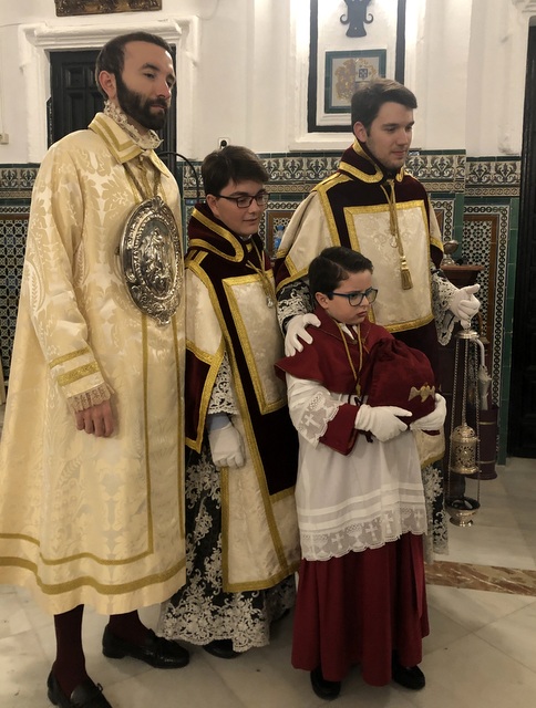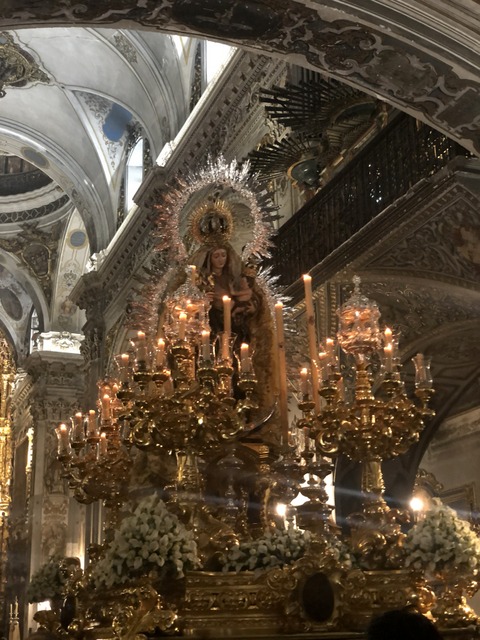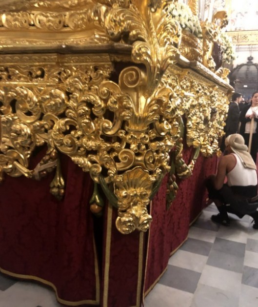 Spent the weekend and Monday being a “fixer” for a photographer coming to shoot virgin processions, as well as different virgins in various churches, for a travel magazine. In the end we saw three processions, but for me this was the highlight, especially because it happened by chance. I had stopped in at the Iglesia Magdalena near my house to ask if I could arrange a photo shoot and the lovely archivist Aurora invited us to come “backstage”, as it were, and see them preparing inside the church just before the evening procession on Sunday. Apparently this was the first time they have ever allowed this for people outside the brotherhood. Wow.