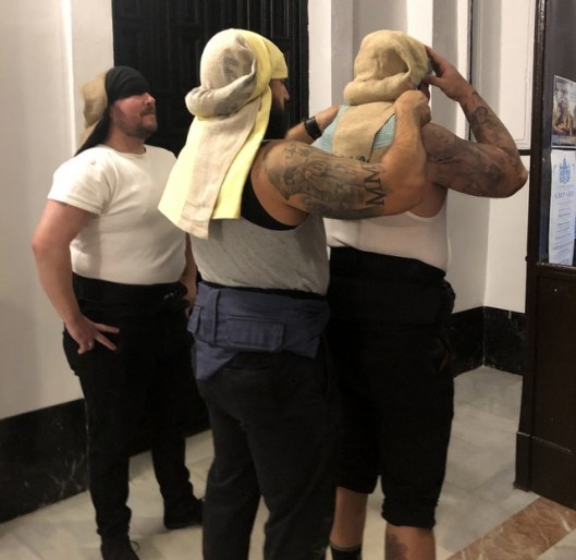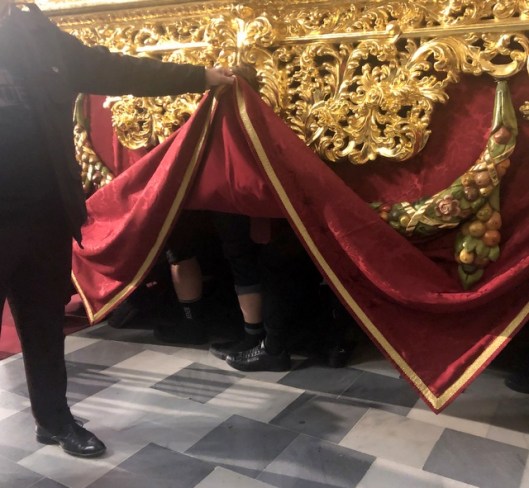 This is the Virgen del Amparo and below are a few pics I took backstage, focusing on the costaleros, who are a bit of an obsession with me during Semana Santa. I mean, I just don’t get WHY they do this, especially as many of them end up with lifelong injuries from carrying all that weight on the backs of their necks. This time I even got a short video of them lifting up the platform with Aurora’s husband holding up the skirting so I could get a better look. I am still going through other photos I took over those three days – might share more later.