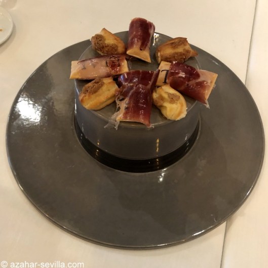 queso a la romana, salmorejo inside puffed cracker topped with jamón