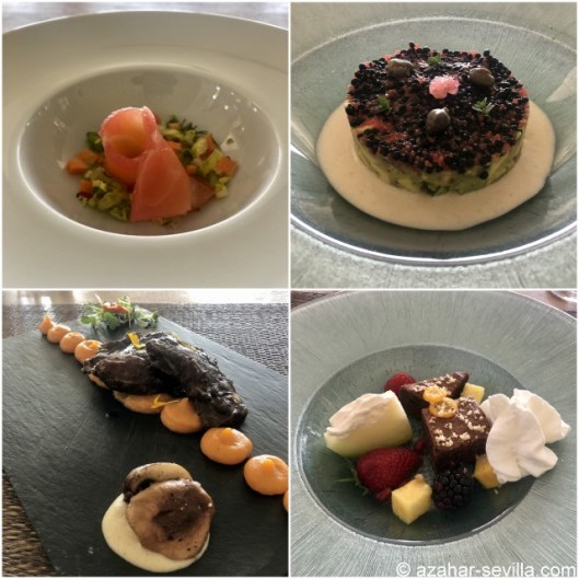 Lunch: gravlax amuse / avocado tartare with jurel, caviar, ajoblanco / Ibérico pork cheek, spiced sweet potatio purée, cream of boletus / brownie with grated walnut, fresh fruit, melon with condensed yoghurt, coconut whipped cream.