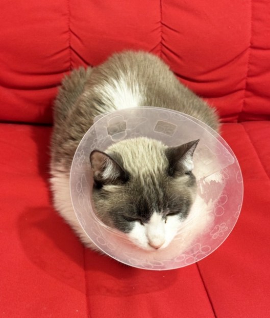 Hopefully the last vet visit for a good while. Today we went to get Luna’s stitches taken out and she really was good as gold. Both incisions had 10-12 stitches each, so it was a slow and delicate procedure, but I held her while the vets worked and, although she winced a couple of times, she was very calm and patient. Now back at home and, unfortunately, she still has to wear the Dread Cone until Friday, while everything heals over completely. But that should be it. What a long, stressful (and expensive) two weeks it’s been.