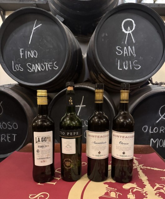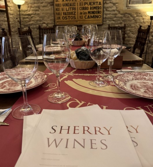 Today seemed like the perfect opportunity to try it out with the slightly smaller group option (6 people) as Pam & Gilbert were in town (again!) with friends and wanted me to give them a little sherry education. So I booked Las Teresas and showed up a bit early, as usual, to help get things set up and… omg. Instead of the usual dining area next to the bar, which is lovely enough, I was directed to the family’s private dining room across the street and saw this amazing table already set up for me. Honestly it felt like Christmas. I felt so happy and honoured that they did this for me. And it really made a difference as this is the longest part of the experience, trying four wines over two courses (starters and mains) before heading for desserts and sweet wines at Vineria San Telmo. In this smaller more private space (the owner and a friend came in for lunch, and there was one other table of family friends, but that was it) is not only much quieter but it really does feel like an extra special experience.