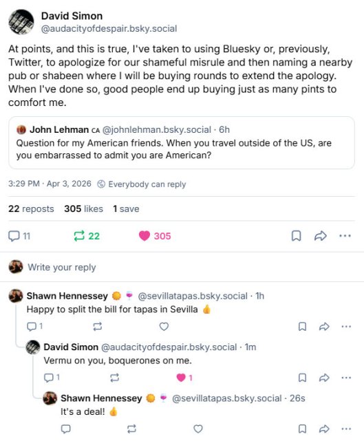 Whenever I’m asked what my favourite tapas bar is (and I get asked that a LOT) or even my top five, I can never answer. Likewise with my favourite song or movie. You know, it always depends. My mood, the weather… lots of variables to consider. But if anyone ever asks me what my favourite TV series of all time is I do not hesitate… it’s The Wire. It just is. Nothing else even comes close. I have followed its creator and writer David Simon on social media for years, first on Twitter and now on Bluesky, and this past weekend THIS happened. Stay tuned…