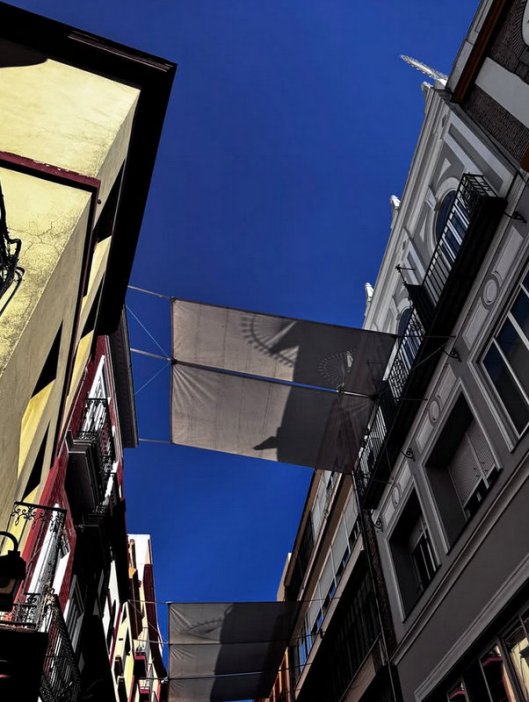 Hobbling home after today’s Sherry & Tapas Tasting I was making my way back by random side streets and before turning left here looked up and went… wow. Placed my crutches against the wall and snapped this. Guys, this is just a regular street here, nuthin “special”, tourists don’t flock to see it. I love the shadow play of the spiky semi-circular rooftop railings on the awnings. I love it all. Also, soooo fucking BLUE. ๐