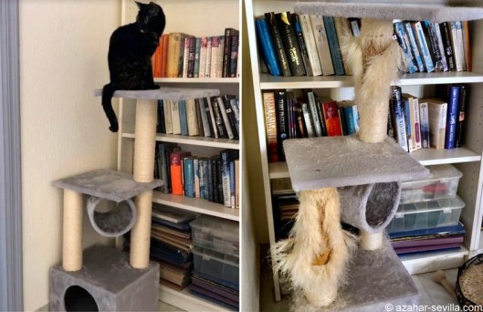 Probably the only one who will miss it would be Luna, so it’s not exactly “essencial”, but Luna has so few things she loves (she’s such a weirdo) that I will leave it here until she actually destroys the cardboard posts themselves (which she did with the previous tower) and the whole thing collapses. But at least the previous one lasted a year and a half. Cats, eh?