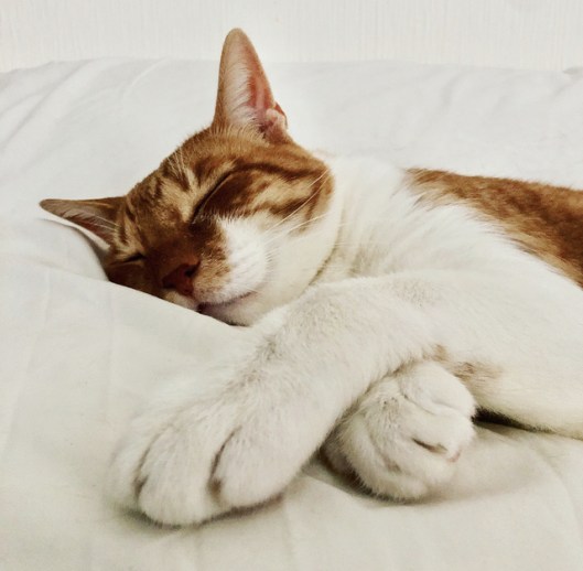 Lovely Luna doesn’t get as much “air time” as the other two. But today I found her fast asleep on the sofa in the timeless paw over face pose and she was just too adorable.