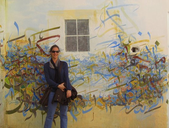 Morocco’s famous “blue village”, Asilah, is a slow and friendly place with a colourful Medina that caters mostly to Moroccan tourists. During the month of August, artists from around the world come to Asilah and paint wonderful murals on the white walls throughout the medina. This is a pic I took of my friend Susan (aka Pipocas) in front of one of the painted walls when we went to Morocco last February.