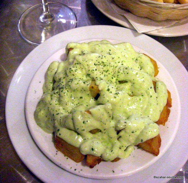 Crispy fried potatoes covered in fresh basil alioli sauce.