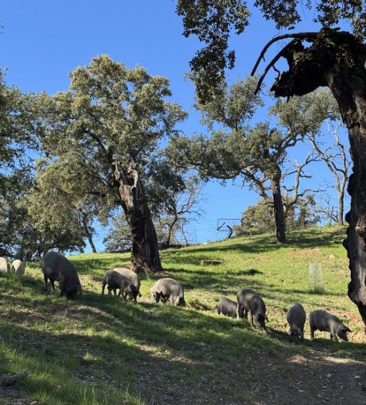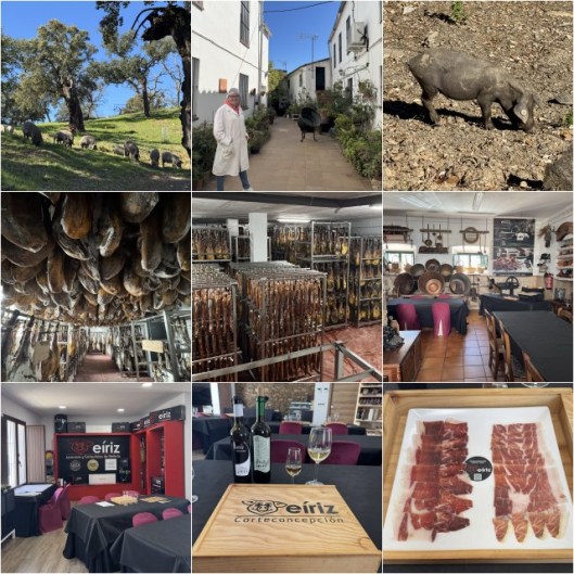 Final day in Aracena. What, so soon? Everything had been planned so well before leaving Sevilla, but you know what they say about plans. In any case, it all started off great (after yet another overpriced meh hotel breakfast). We were picked up by Belén Reyes from Jamones Eíriz so we could visit her family’s bodega in Cortaconcepción. I was put in touch with the Eíriz family by my good friend and neighbour Mariano García (Cafetería Donald), who has been their client for over fifty years. And I was eager to visit because they are a smaller more artisanal producer, kind of the opposite end of the scale from Cinco Jotas. It turned out to be not only an interesting contrast, but also super educational. Delicious too as we were treated to a great tasting of jamón and charcuterie paired with local wines at the end. Plus I GOT TO SEE PIGGIES.
