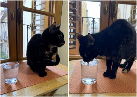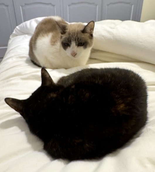 A few hours (and 400€!) later we were home again with a very groggy Luna. I made up a little bed for her on the living room floor, with food and water and a litter box nearby, but she kept wanting to be up on the sofa. Sonia had said not to let her climb up on things but in the end I gave in and let her stay on the sofa and put cushions all around on the floor in case she fell off. She didn’t. In fact, she spent most of the time gazing lovingly at her favourite person in the world (hint: it’s not me) and a while later was ready for a little paté and water.