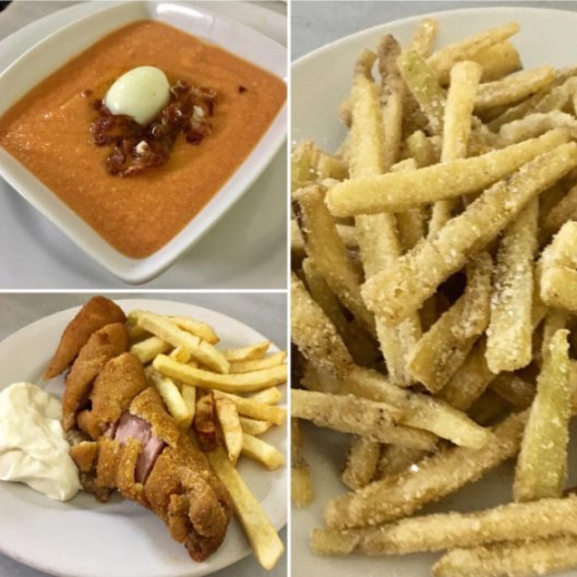 Salmorejo is a part of what I call the Córdobes Holy Trinity of tapas, which also includes flamenquín and berenjenas fritos. We ended up ordering all of these when we were at Taberna El Gallo the other day and – wow! – I have to say that all three were probably the best I’ve had anywhere. The salmorejo was delicious and had a lovely texture, not “over processed”, as if a mortar & pestle had been used. Also a nice touch – the hard boiled whole quail egg. The flamenquín was unlike any I’d had before, simply with pork loin and serrano ham rolled up, breaded and deep fried. Most places add cheese or other fillings, but the waiter at El Gallo told me this was the original version. Last but not least… amazing aubergine/eggplant frites! Crispy fried, tender (not mushy) inside, and – most importantly – no gacky sweet molasses (called miel de caña “cane honey” here) squirted all over them. I love this bar.