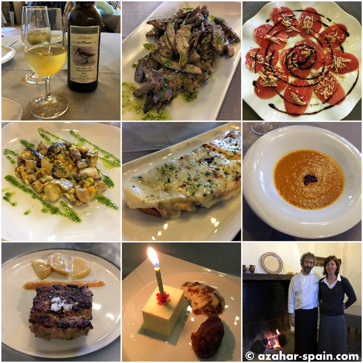 We arrived at Linares de la Sierra (population 300) via a narrow winding road with spectacular views, which were occasionally and dramatically cut off by sudden fog. Once there we made our way to Mesón Arrieros for lunch. To call this place a hidden gem is an understatement. You are NEVER just going to happen upon this place, you will always make a specific effort to do so. And it will always be worth the effort. We were welcomed by biz (and life) partners, chef Luismi and front of house wiz Adela. Once seated Adela suggested we start with a manzanilla en rama from Barbadillo… she couldn’t have been more spot on. What a refreshing and delicious way to start a meal. We agreed to just let Adela bring us WHATEVER… and it was amazing. Starting with probably my favourite dish of the day, marinated pork liver dressed with onions and cilantro oil. This was followed by presa Ibérica carpaccio, with foie… grilled boletus mushrooms with scrambled eggs, garlic oil and cilantro… melted goat cheese on country bread, topped with a drizzle of local honey and a sprinkling of same herbs the goats eat… a comforting tomato soup with cumin, mint, oregano and a dollop of fig jam… presa Ibérico burger with peach jam… and a birthday cheesecake! After all this it was time for a walk.