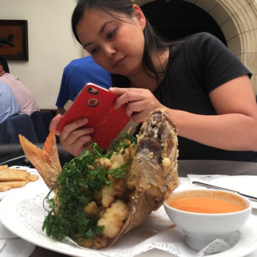 Then we got a taxi over to El Faro for our “main course”. We were happy to discover that there is now a tapas menu other than at the bar – one of the formerly unused patios has been transformed into a bright and cheerful tapas area. All I knew was that I wanted to try THAT tempura fish we’d seen prepared during the Tempura vs Fritura competition the day before at Copa Jerez. We started off ordering a few dishes to share, but it turned out that the tempura fish version offered on the tapas menu didn’t include the wonderful “whole fish” presentation you see here. But then it turned out that we could also order restaurant menu items in the tapas area! So we quickly revised our order to include only the Almadraba tuna tartare and then THAT fish. In this case it was urta and it was perfect. Weirdly served with salmorejo as a “dipping sauce”… we chose to drink the soup and just have the tempura urta on its own. The tuna tartare looked like rubies and was served with wasabi, ginger and horseradish. Heaven.