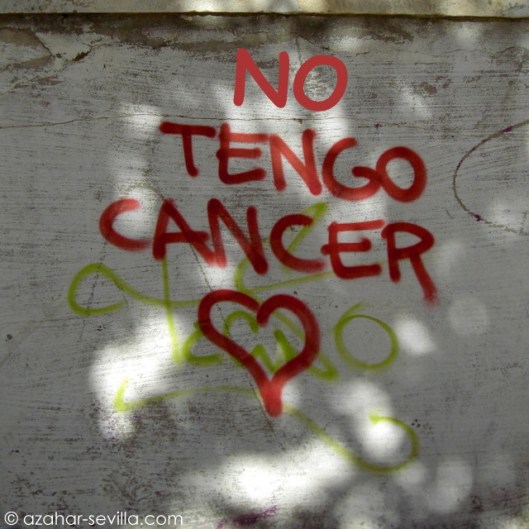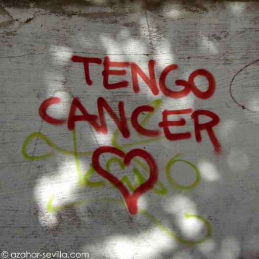 This has been a strange week for me. Exactly ten years ago I went to the Feria de Jerez and spent a fun day there with friends. And on the way back to get the train I saw this graffiti (Tengo Cancer – I Have Cancer) on the wall beside a bar next to the station, and something about it moved me to take a photo. There was something poignant yet hopeful yet… I dunno… about it. Whatever. I took the photo.