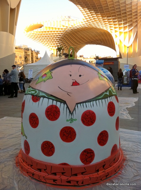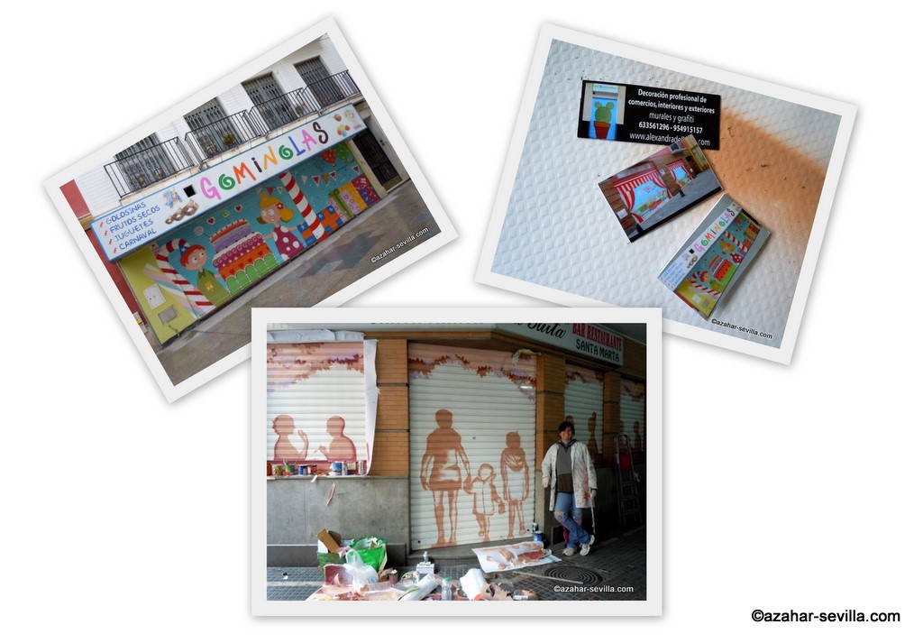 So I was surprised to come across Alexandra Del Bene the other day while on my way home from a walk around the Alameda. She was busy with spray cans and paint brushes painting the window protectors of the Santa Marta Bar (home of Sevilla’s largest flamenquín!), but it looked to me as if she were doing a job and not just a hit and run burst of “artistic expression”, so I stopped and asked if she’d been commissioned to paint the Santa Marta. Turns out that a lot of people have been commissioning her to paint their storefronts so that they won’t get vandalised by roving so-called “graffiti artists”, who curiously don’t vandalise Alexandra’s stuff. I guess it’s a sort of professional courtesy?