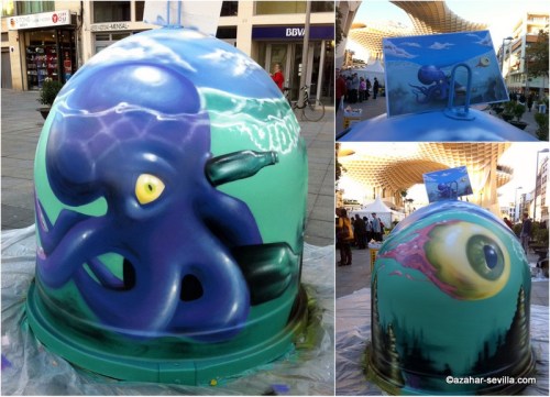 Yesterday afternoon I came across a group of graffiti artists participating in a competition, painting glass recycle bins (concurso contenedor vidrio). This has been going on for the last few years. Or at least, I’ve noticed the painted bins around town before but have never seen the annual contest in progress until now.