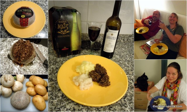 When my friend Del (aka @WeeRascal) came for his third visit to Sevilla last month he brought me not just a haggis but The McSween Haggis, which I was assured was the very best haggis in Scotland. The proper accompaniment to a haggis dinner is tatties & neeps and luckily I was able to find some small turnips at the market. And so last night was the night! I had been waiting for flatmate Jessica to be in town long enough to join Nog and me for dinner and so, although I’d spent a pleasant afternoon tapearing with Rebecca from Jaén and wasn’t sure if I was up for another meal, there was nothing for it. The time had come to finally cook The Haggis.