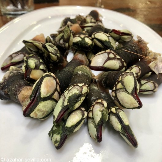They really do look like dinosaur toes, don’t they? They are actually goose barnacles, called percebes in Spanish, and I have been dying to try them ever since I first heard about them. Why? Well, why the hell not? Recently I heard that one of my favourite seafood tapas bars – La Moneda – has been serving percebes and I asked them if they could let me know the next time they got some in. Turned out that was today! Not the best timing as Peter and I had just stopped off for a couple of tapitas with my familia at Bodeguita Romero – celebrating my shiny new laptop purchase (more on that later!) – and after our second tapa I got a Twitter message from Isidro that the percebes had landed.