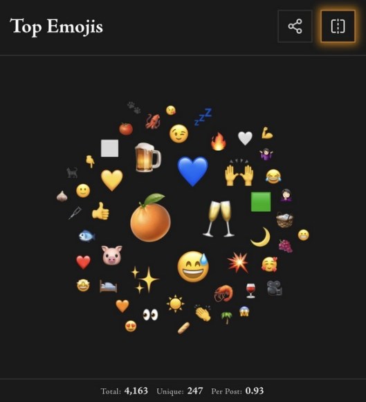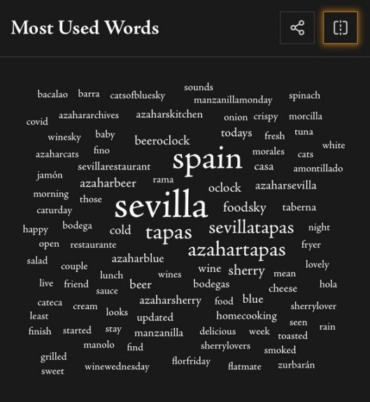 The Bluesky Harvest thingy goes through all your posts for the year and shows you, well, these recaps. This one is for my Sevilla Tapas account (the Azahar account I mostly use when I’m feeling cranky or need a rant, and also to post my wordle scores). I have to say the Most Used Words one seems to be mostly based on hashtags, so not really MY words. But whatever, just a bit of fun.