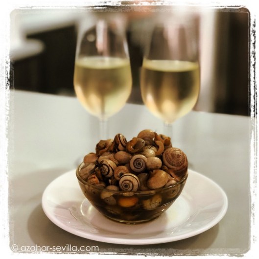 For those of you who think it’s all fun-fun-fun around here, with endless glasses of sherry and an infinite array of tapas… well, actually it is kind of like that. 😉 Though not every day of course, and not as “constant” as it may appear to be on my social media accounts. Heck, I can make one tapas bar visit last several days on SM via my various accounts. Also, I kind of publish things at random, so if you ever think I am drinking wine at 10 am… chances are I’m not (though on rare occasions it has been known to happen). Which brings me to SNAILS.