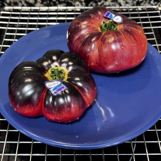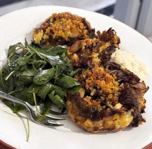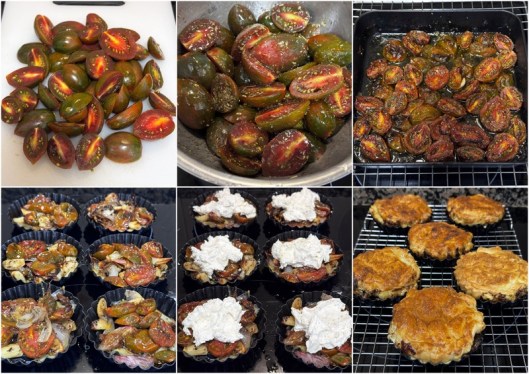 The only way I’ve ever enjoyed cherry tomatoes has been roasted so I decided to do that with these baby kumats and found a recipe online for “upside down” tomato puff pastry thingys (three mini pastry tins fit in the air fryer perfectly). I added roasted shallots and garlic, and some herb cream cheese, which made them tricky to flip over as you can see on that messy plate below, but they were delish. The others I just ate sliced with evoo and maldon salt. So much flavour there it would be a shame to miss out.