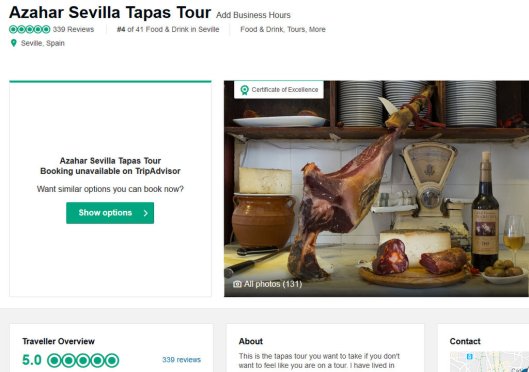 I can only hope that discerning travellers are going to see through this vile ruse. Many already tell me that when they see promoted Google ads they go right past them and look for the organic search results, even up to 3-4 pages. Happily I am still on the first page when people google “tapas tours seville”. Likewise, I think people are going to realise that the listed TripAdvisor “top food tour companies” in Sevilla and elsewhere are simply those who have paid to be there and have nothing to do with genuine quality.